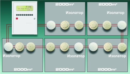 Основи с изолатор на късо съединение трябва да бъдат инсталирани, за да ограничат ефекта от повреда в линията за охраняема площ от 2 000 кв.м. Един аналогово-адресен кръг(loop) може да обхваща не повече от 10 000 кв.м. |