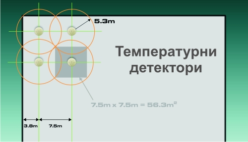 Температурните детектори са подходящи за помещения с по-високи температури и наличие на изпарения, за които не е уместно използването на димооптични детектори Радиусът на покритие на термичните детектори е 5,3 м. Радиусите на покритие трябва да се припокриват с цел предотвратяване на наличието на “слепи места”. Покритието на всеки детектор може да се представи като квадрат с размери 7,5 х 7,5м, което прави действителна площ на покритието от 56,3 м2 за всяко устройство. |