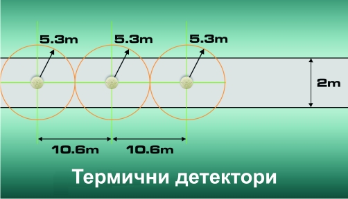 термодиференциални детектори е 9 метра. Термичните детектори трябва